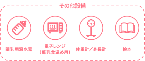 1階から3階の各授乳室には、個室授乳室(全室時計付き)、おむつ替え台、調乳用温水器を設置しております。